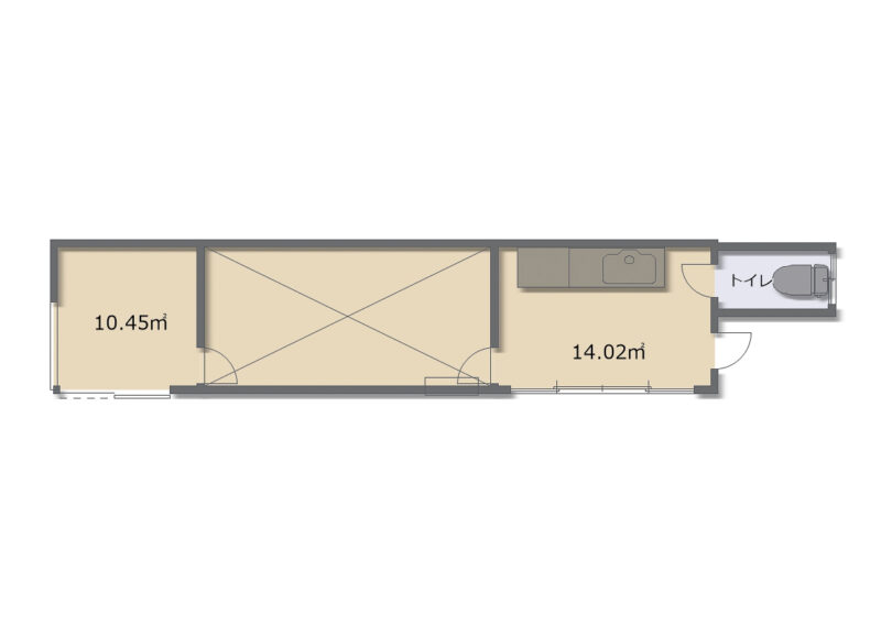 広さは14.02㎡、ガスコンロ・IHどちらも設置可能なキッチン付きです。