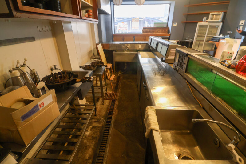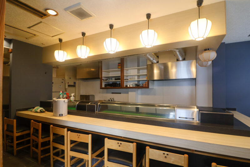 お寿司屋さんの名残が色濃く残る1階は、10席ほどのカウンター席です。