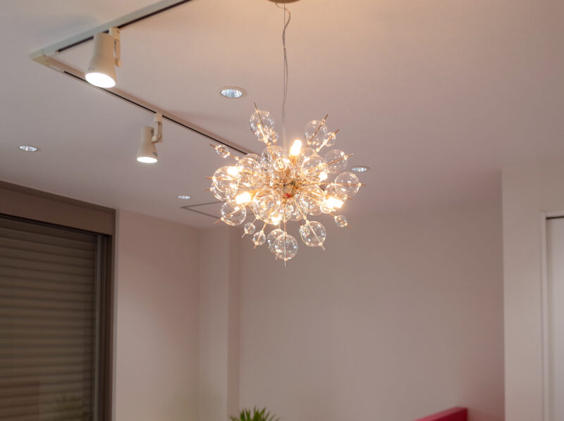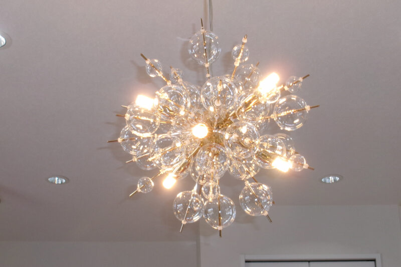 天井には、ゴールドの軸とあたたかみのあるオレンジの光がポイントのモダンシャンデリア。