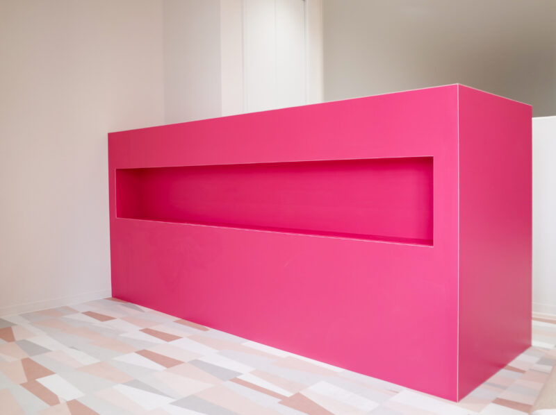 店内に入るとまず目に飛び込んでくるこちらのモードなかわいさが宿るピンクカウンター。