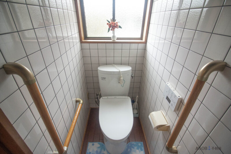どの角度でも支えられそうな手すりが完備されたトイレ。